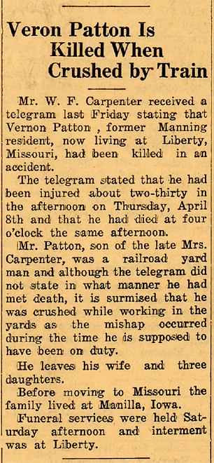 Mr. Patton, who was a cousin of Alice (Mrs. August) Warnke of Carroll, spent most of his life in Manning, where he was born July 24, 1893. He attended Manning High School. He was a member of the Presbyterian Church and was active in church work, especially in the choir in which he sang bass.