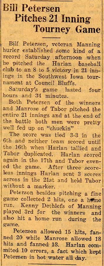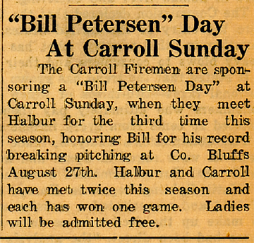 Mr. Petersen was born October 10, 1907, in Lincoln Township, Audubon County, a son of Chris and Dora (Hagedorn) Petersen. He graduated from school here in 1927 and worked for Dultmeier Manufacturing Company at Manning. On July 11, 1942, he married Helen Wegner of Neosho, Missouri. He served in the European theater during World War II, and later was employed as a city route carrier at the Manning Post Office. He worked for the Post Office from 1949 to 1970.