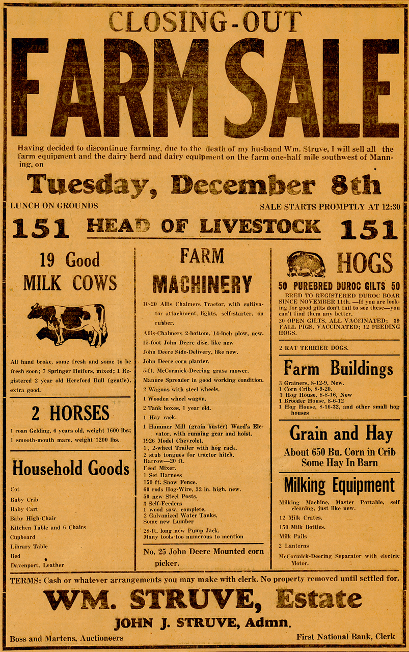He farmed one mile southwest of Manning. He was a crop farmer, raised pure bred Duroc hogs and had a milk delivery route.