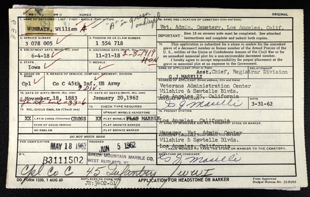 Survived by his wife, Adella Wunrath; 1 daughter, Mrs. Rosalie Huff of Arcadia, California; 3 sisters of Omaha, Nebraska.